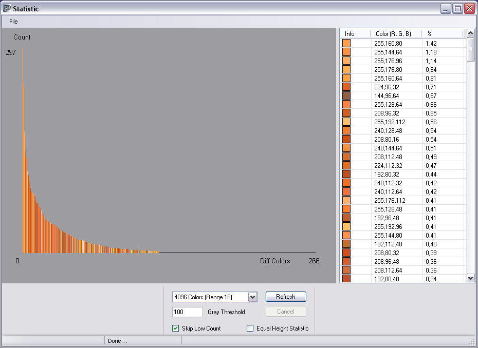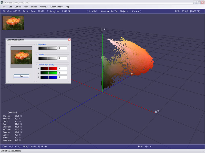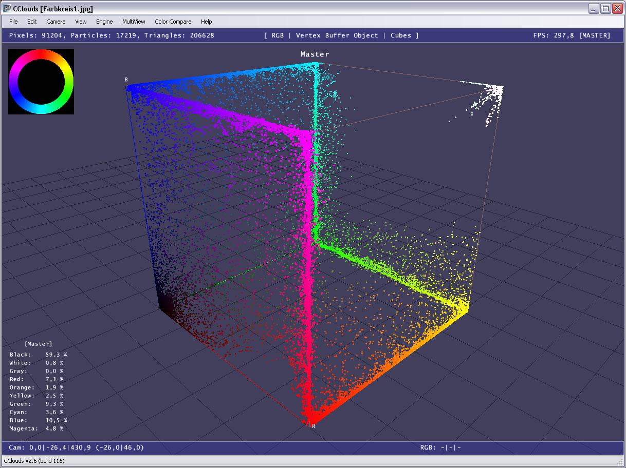 The image data will be analyzed on loading and the colors will be visualized by a particle system. The program currently supports 9 differrent color spaces. They can be switched at any time making a comparison possible. In addition to the extensive options to influence the colors of images, the software implements also functions for image manipulation. Thus, e.g. the effects of color manipulation on the colors and the color distribution can be viewed in 3D. In addition the engines supports the visualization of two particle systems to make a analyzation of differences between two images possible.