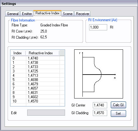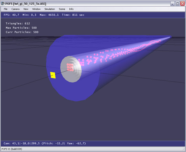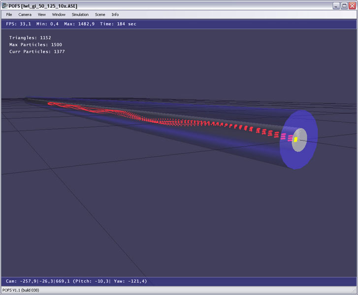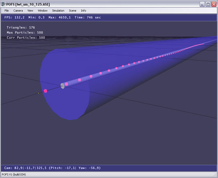 POFS (Particle Based Optical Fibre simulation) is a software to simulate and display the light spread in a fiber-optic cable using a physically correct calculated particle system. The underlying engine is based on the C3CS and some functions of the raytracing library Powertek.Rt and allows the calculation of the spread and movement of all particles in the system using optical laws. The software offers a wide range of adjustable parameters, such as particle number, direction, speed, etc. Customized ASE-files are used to load and simulate different optical fibers with different refractive indices of core and cladding.