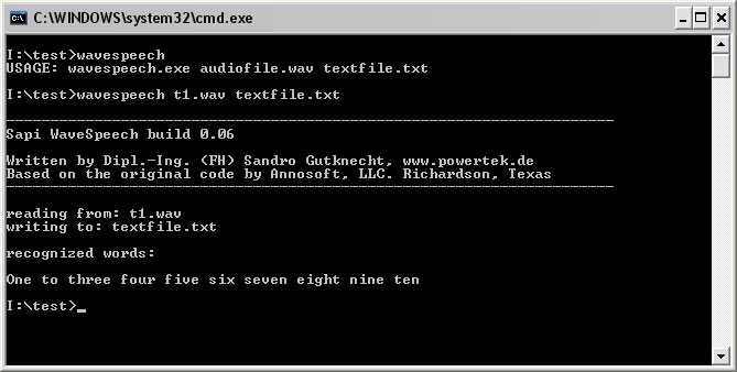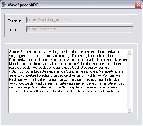 Wave Speech is a software package consisting of the GUI application AviSpeech and the console application Wave Speech which implements a speech recognition for audio and video data. The input data stream (video, audio, or both) will be converted by AviSpeech to an wave audio stream, and depending on the installed voice recognition package, the result is transmitted to Wave Speech or WaveSpeechDRG. WaveSpeech uses the Microsoft Speech SDK 5.1 for speech recognition, WaveSpeechDRG uses the Dragon Naturally Speaking 8.0 SDK. The output of both programs will be a textfile containing the spoken words of the input stream.