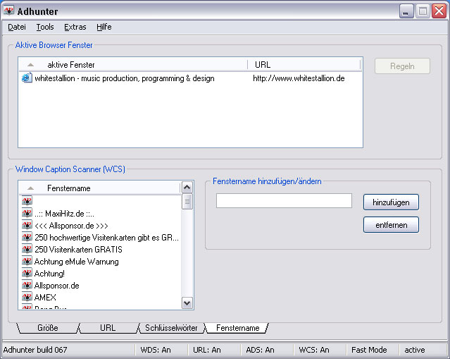 Adhunter is a pop-up blocker for the 3 webbrowser Internet Explorer, Mozilla, Firefox and uses blacklist for the blocking of websites and ads. This means that open browser windows will be checked with the entered rules and will be closed on conformity. To avoid that for each new window also a new rule must be created, the software implements 4 independent scanner (window size, URL, keywords, window name) and also
